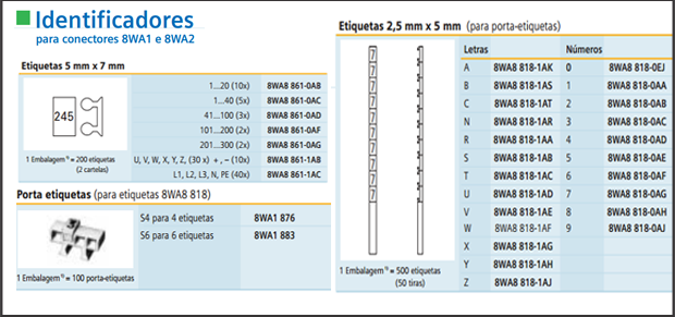 Identificadores: 8WA Siemens - cartela com 51 ou 68;Para cabo 0,15 a 0,5 MM2 / 1,5 a 2,5 MM2 / 4 a 6 MM2.