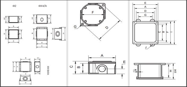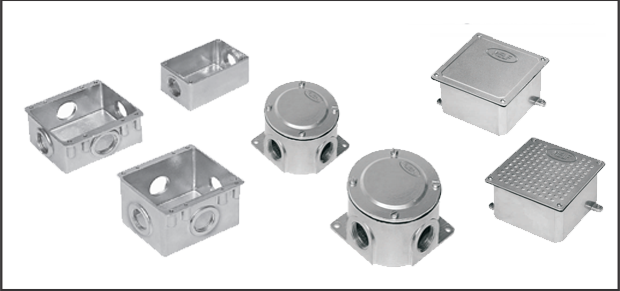 Caixa de ligação e passagem quadrada, fabricada em liga de alumínio, orelhas de fixação reforçadas. Junta vedadora de borracha. Tampa reversível sendo de um lado liso e o outro antiderrapante, podendo ser utilizada tanto em parede como em piso.