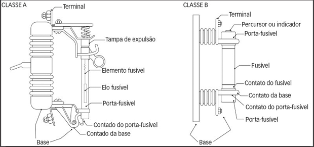 Os dispositivos fusíveis de alta tensão classificam-se em Classe A e Classe B, conforme valores padronizados de alta tensão de restabelecimento transitória para as sequências de ensaios (1, 2, 3 e 4) de capacidade de inspeção.